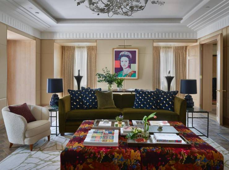 设计师与知名供应商合作,将其设计理念转化为现实。Winch Design为主卧套房设计了一系列质地厚重的手工编织面料,其中的anamar面料则受到伦敦著名的萨维尔街(Savile Row)和杰明街(Jermyn Street)风格的启发。这一系列面料还包括手工制作的丝绸,衬映室内色彩斑斓的自然光。英国大师级裁缝Holland & Sherry为书房、餐厅和客房定制了专属刺绣和面料,而餐厅的座椅则采用其定制款现代英国犬牙交错图案的装饰。 顶层公寓的客厅中,英国著名家具制造商Robert Langford的古典家具结合了The OWO本身的乔治亚建筑风格,并选用法国布艺品牌Pierre Frey的艺术感几何图形织物,赋予其现代感,彰显新旧融合的风格。来自斯德哥尔摩的现代家具品牌Modernity则为公寓注入了冒险风格。