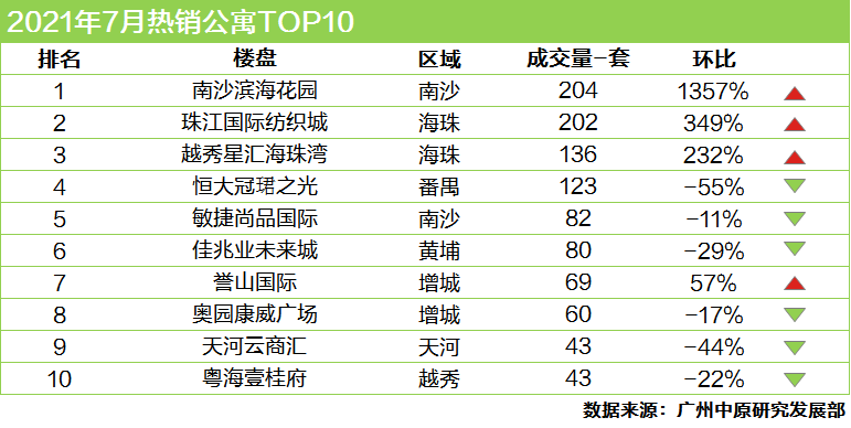 本月南沙滨海花园以204套的销量跃居榜首,交易单位主要为项目4-2#栋公寓。海珠区珠江国际纺织城、越秀星汇海珠湾成交热度提升,分别以202套、136套排行第二、第三位。番禺区恒大冠珺之光继上月集中去化后,本月交易放缓,录得123套公寓成交。其余上榜项目成交在40-80套的区间左右。