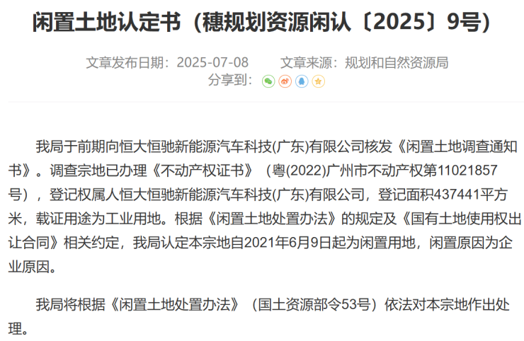 近日,广州南沙区规划和自然资源局发布一则闲置土地认定书(穗规划资源闲认〔2025〕9号)。指出恒大恒驰新能源汽车科技(广东)有限公司位于南沙的,已办理《不动产权证书》(粤(2022)广州市不动产权第11021857号)的约44万㎡工业用地自2021年6月9日起为闲置用地,闲置原因为企业原因。将根据《闲置土地处置办法》(国土资源部令53号),依法对该宗地作出处理。