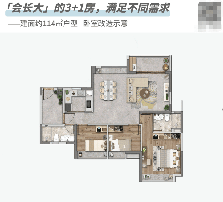 建面114平方米的3+1房“会长大”:可以根据家庭需求不断“进化长大”。进门处的全明入户花园,可视家庭所需做成多功能空间,种植绿植,放置鞋柜收纳柜,或者做成孩子的游戏空间;横厅设计令餐厅、客厅形成7米长的大采光空间,你渴望四房,安放好长辈与两个孩子,那么不需要换房,这个横厅设计可以进行改造,三房变四房,尽情展示生活创想,并且原本横厅餐厅自带飘窗,这个小细节让改造后的卧室,也有了城市观景台,一眼望去尽是珠水夜韵,美好生活不将就。