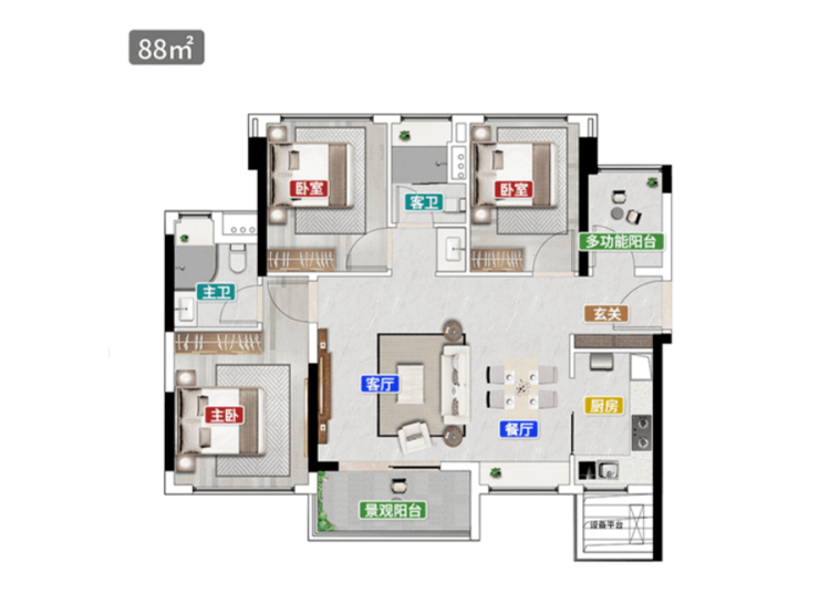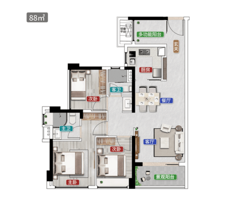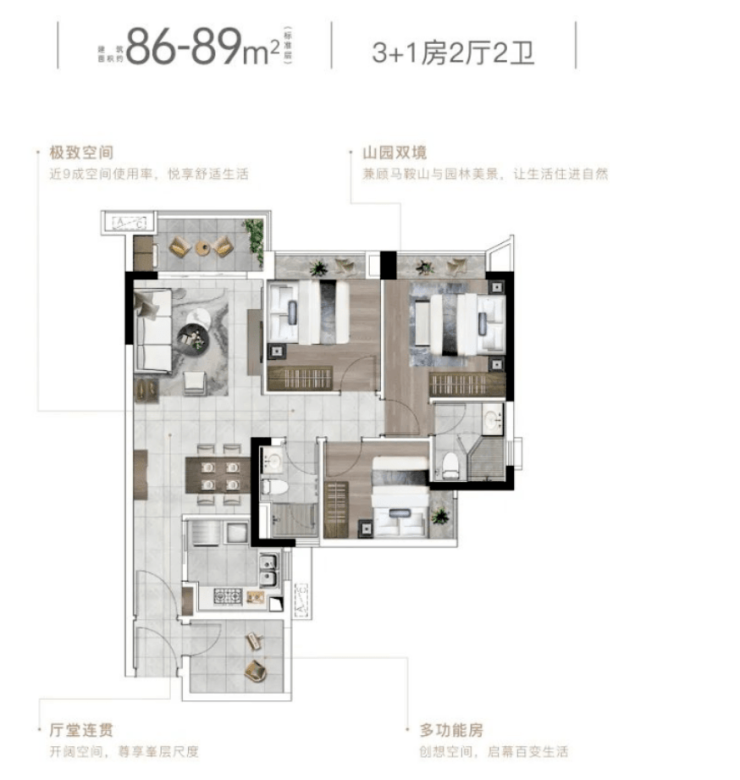 其户型也是出了名的“能打”。建面约86-89㎡不仅为三房双卫设计,还多了一个功能房,且多功能空间阔绰,做书房,游戏房均可,家庭人口多的话还可改成为四房,同等面积多一房;近9成的空间使用率,大大提高了生活舒适度。