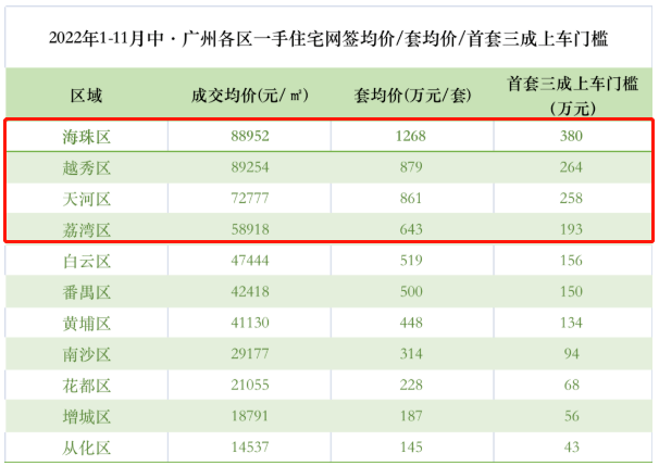 据克而瑞数据,今年截至11月中,老四区中成交均价最高的区域为海珠区,近8.9w元/㎡,套均价1268万/套,为广州11区中唯一套均价破千万的区域;成交均价最低的荔湾区也近5.9w元/㎡,套均价643万/套,最低首付门槛为193万元...