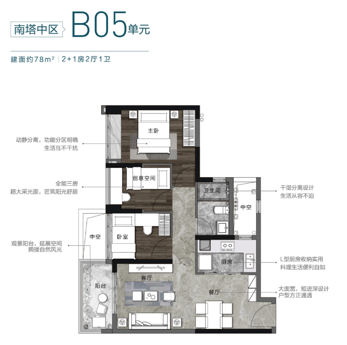 建面约78平2+1房,经典竖厅设计,客厅、卧室一字排开,拥有超大采光面,将阳光、清风尽情纳入屋内,2+1房设计三代同堂居住也可满足。