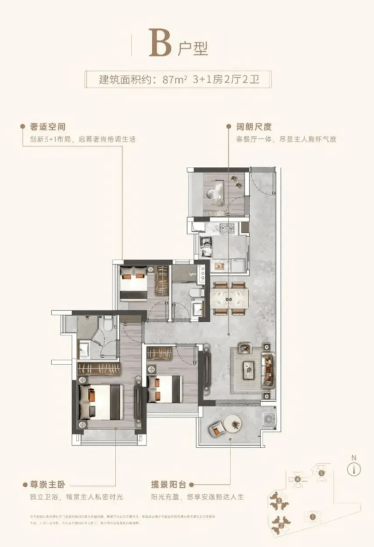 87平的户型,做到了3+1房,而且带主套,尺度感不错,动静分区也做得比较好,适合两个娃以上的家庭居住。而且,户型两个卧室均与阳台同一朝向,如果是朝南的单元,居住舒适度是比较高的。