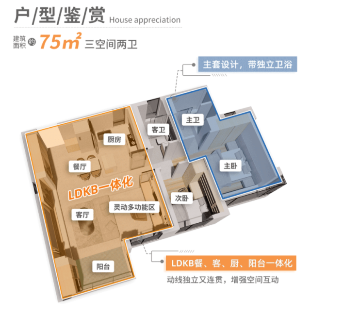项目最大的亮点还是其户型,主推建面约75㎡3空间、82㎡3空间和105㎡4空间三个户型,均为 LDKB一体化设计。
