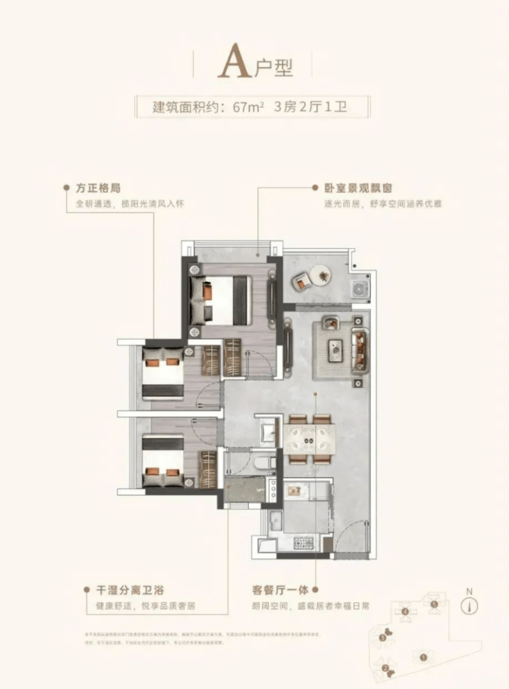 项目总规划共有5栋住宅,配建幼儿园。产品方面,现在在售的两个户型都相当实用,67m²的三房和87m²的3+1,使用率都超过9成。