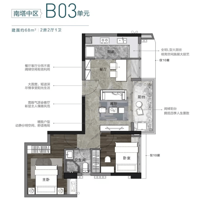 建面约68平的2房户型则适合年轻三口之家,不光做到了极致横厅、还有L型厨房,空间感满满。