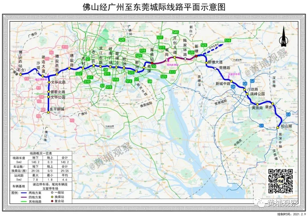 上面这张地铁28号线示意图,最近首次在黄埔观察VIP付费微信群曝光后,已被一些人转出,并在一些公众号上流传。对于重要的干货,一般我们是不急的,让子弹飞一会再说。我们对于流量,不是特别饥渴,更侧重于沉淀有价值的东西。考虑到28号线黄埔段几个站点,特别是经云埔的两个站,周边均为工业区,并未有楼盘——周边楼盘中,最近的爱特城也要2-2.5公里,中海誉城将近4公里,中央城3公里左右,富力悦禧约2.2公里,富力新城约3.2公里。几个楼盘都不在正常步行通勤范围,影响有限,所以我们决定说一说。我们手上还有更为详细的线路图,可以清晰看到设站具体位置和出入口,就先不公开了。上面这张图已经够用了。上面的28号线示意图,标明的制图时间为2021年2月9日。如不出意外,这大致是较新的图了,应该不会大改了,即便局部微调,也不影响整个线路的走向,甚至站点设置了。较新线路图显示,28号线全长140公里,全为地下线,全程设站29座,其中换乘站25座,较大站间距7.8公里,最小1.8公里(主要为佛山市区和广州市区段),平均站间距4.6公里,设计时速160公里/小时。01较新版本四处重大调整对比今年稍早前网传的如下版本(下图),较新版本做了以下调整: