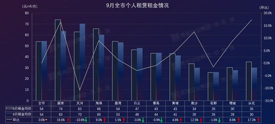 全市租金与上月持平,其中天河下跌10.8%,从化增幅较大,达17.3%。