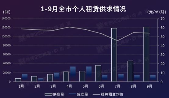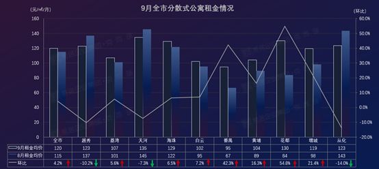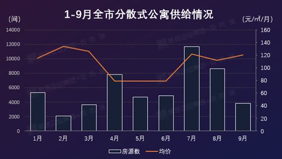 随着传统租房旺季影响力削弱,9月分散式公寓供给动力下降,环比上月下跌56%,全市租金为120元/㎡/月,微涨7.2%。