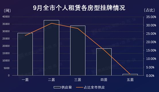 租金走势方面,1-9月二房、三房房型租金趋于平稳,较年初小幅上升;一房、五房本月租金波动较大,较年初下降明显,分别达37%、31%。
