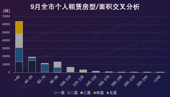 一房面积段集中于60㎡以下;40㎡以下的三房、四房多是单个房间面积,为合租模式,中小面积房源仍是市场主推的房型。