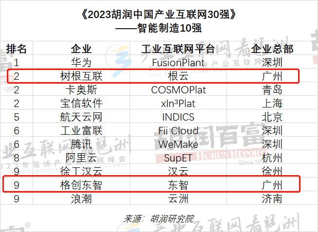 在产业互联网—智能制造10强排名中,广州的树根互联、格创东智上榜,如下图: