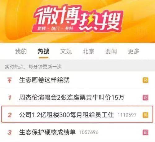 以“公司1.2亿租楼300每月租给员工住”的词条,迅速登上微博热搜第二名。