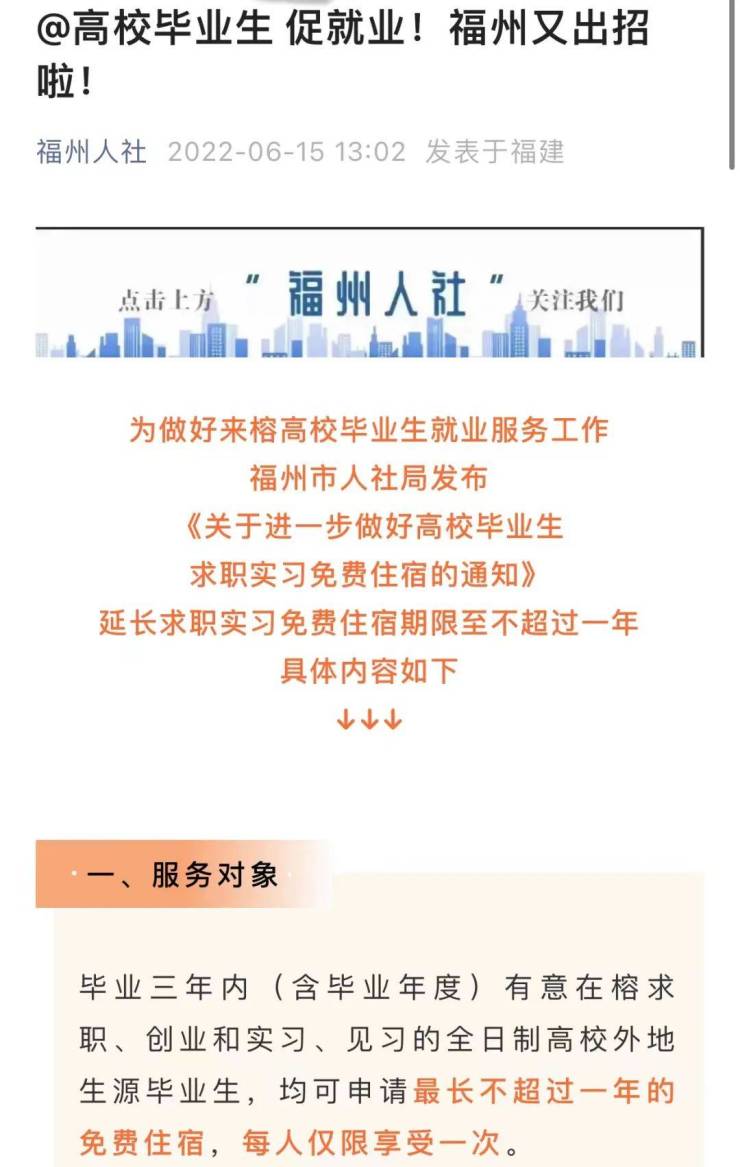 6月15日,福州人社微信公众号发文,延长求职实习免费住宿期限至不超过一年。毕业三年内(含毕业年度)有意求职、创业和实习、见习的全日制高校外地生源毕业生,均可申请最长不超过一年的免费住宿,每人仅限享受一次。