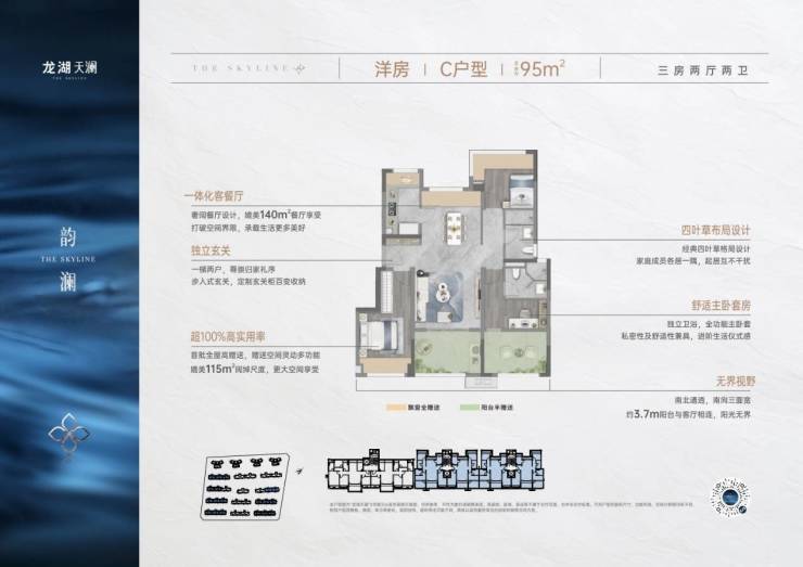 其他户型同样惊艳。建面约95㎡户型,赠送面积约18㎡,实际使用率达到惊人的103%,空间尺度可媲美115㎡的户型,堪称全屋高赠送的典范;整体布局采用经典的四叶草形式,家庭成员各居一隅,起居互不干扰。建面约85㎡户型,设计为3房2厅2卫,非常适合两三口之家;入户的S形收纳设计,巧妙地提升了空间利用率;客厅约26㎡的宽敞空间与约3.6m宽的阳台相连,通透采光极佳,营造出明亮舒适的居住氛围。