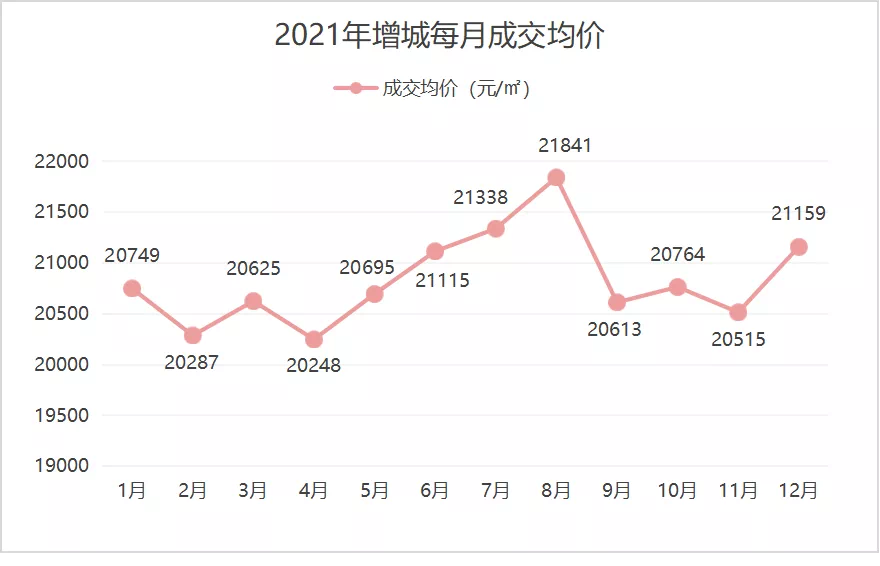 值得注意的是,增城每月成交均价变动不大,均在2万/平左右,而成交均价较高的月份是8月,其次是7月和12月。