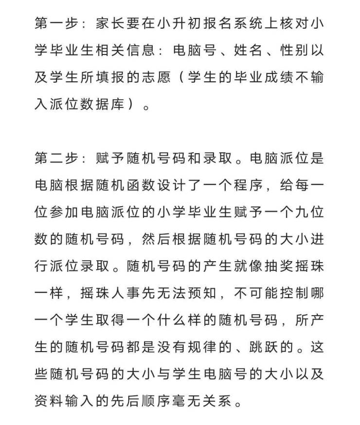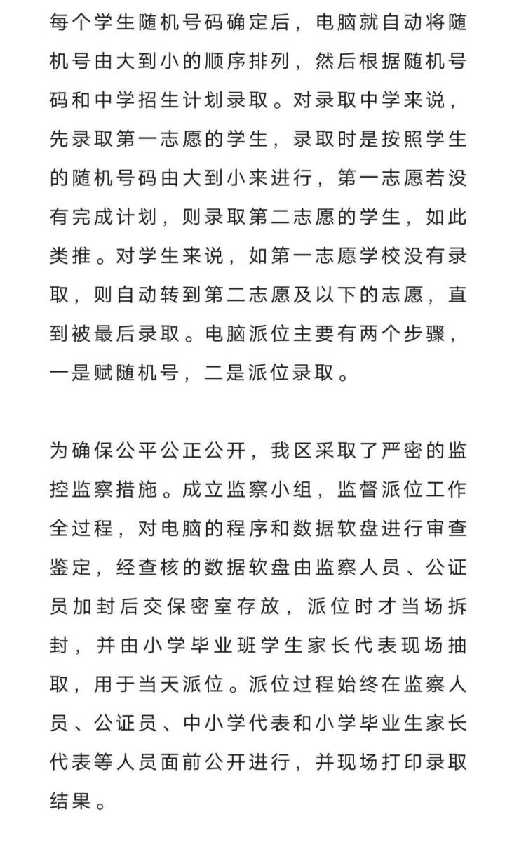 5月10日前,区教育行政部门组织招生人员审核报名学生提供的材料并公示报名审核通过名单,公示时间为3天。5月16日,若报名人数超过招生人数,由区教育行政部门采取电脑派位方式确定最终录取名单并进行公示,公示时间为3天。