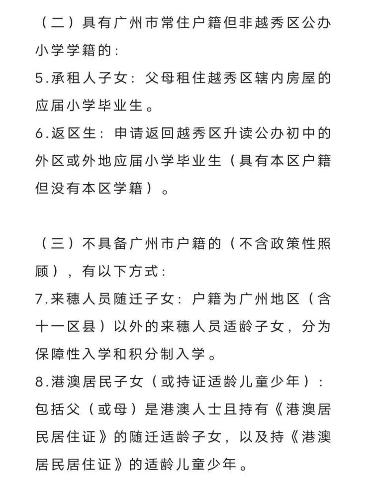 据悉,凡小区内配套的义务教育公办学校,在解决该小区户籍(含符合广州市政策性照顾条件的业主子女)及附近居民符合“人户一致”条件的适龄儿童、少年入读,以及预留用作解决该年段将户籍迁到该住宅小区的适龄儿童、少年学位后,如有剩余学位,优先解决在小孩入学当年,该住宅小学近6年(或初中近3年)未有安排小孩入读该小区配套公办小学(或初中)的业主(指购房并在申请入学当年5月31日前收楼且拥有该房产100%份额。下同)子女。