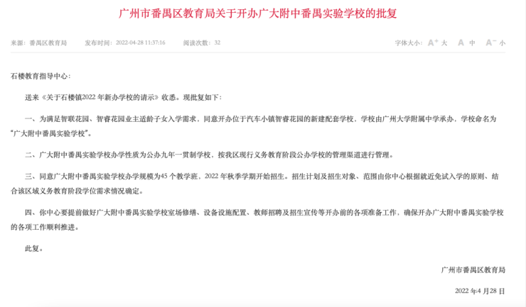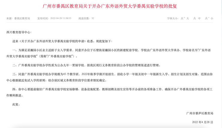 4月29日,广州市番禺区教育局公布《2022年番禺区义务教育阶段学校招生计划、招生地段及条件》,此外,番禺区教育局于日前公开了多个开办学校的批复。