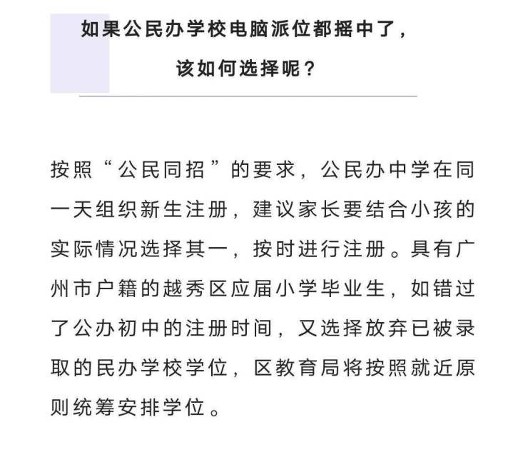 如何落实“公民同招”?《招生指引》介绍,为较大限度保障学生和家长的选择权,白云区基本延续以往招生工作主要进程,分别明确公办学校和民办学校的录取结果,安排公民办小学、公民办初中在同一天组织新生注册,由家长和学生自主选择确定注册学校,注册即确定学位。