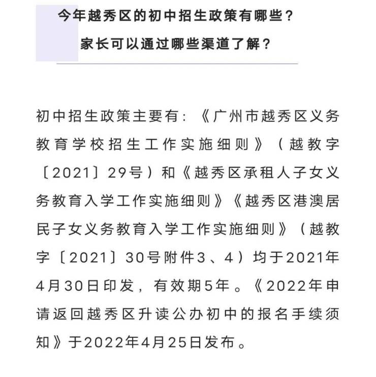 4月29日,越秀区教育局公布《广州市越秀区义务教育学校招生工作实施细则》,根据今年越秀区小升初工作安排,部分学校有调整,育才实验学校转为区属公办寄宿制初级中学;二中应元学校转为公办,并入二中初中部,2022年起不再以二中应元学校名义招收新生;豪贤中学并入十三中,今年起停止招生;八一实验学校开设“八一·华附海航少年班”,面向越秀区全区招生。