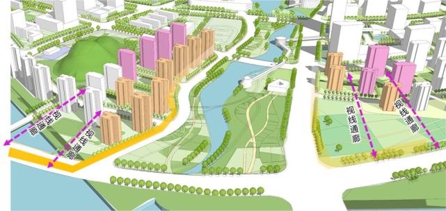 按照要求,滨水一线建筑高度控制在45米以下,临楔形绿地一线建筑高度控制在60米以下,向街区内部逐渐升高,以塑造良好的城市天际线。沿河建筑塔楼面宽控制在40米以下,预留视线通廊。