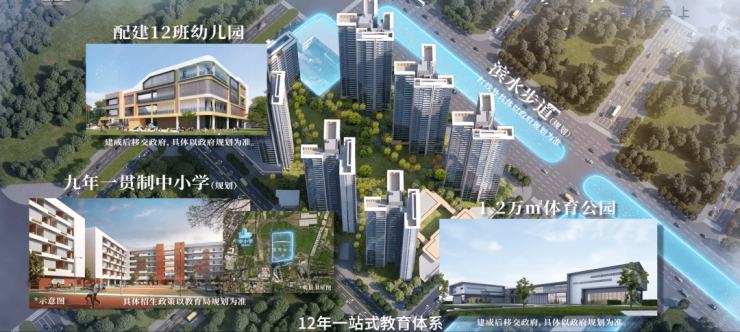 教育方面,项目自身配建12班幼儿园,西北侧还规划1所九年一贯制学校。