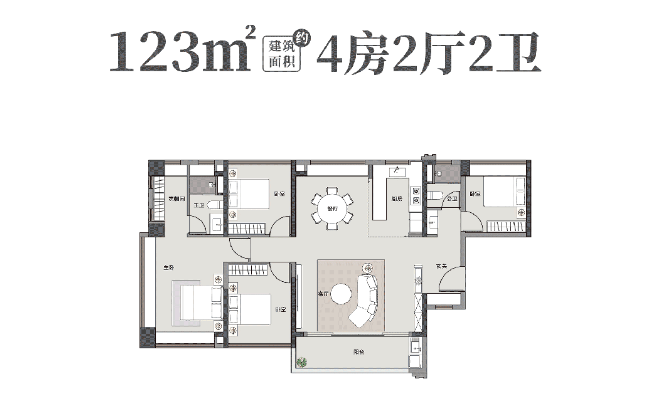 建面约123平四房户型,得房率更是达到惊人的110%!就问你服不服!