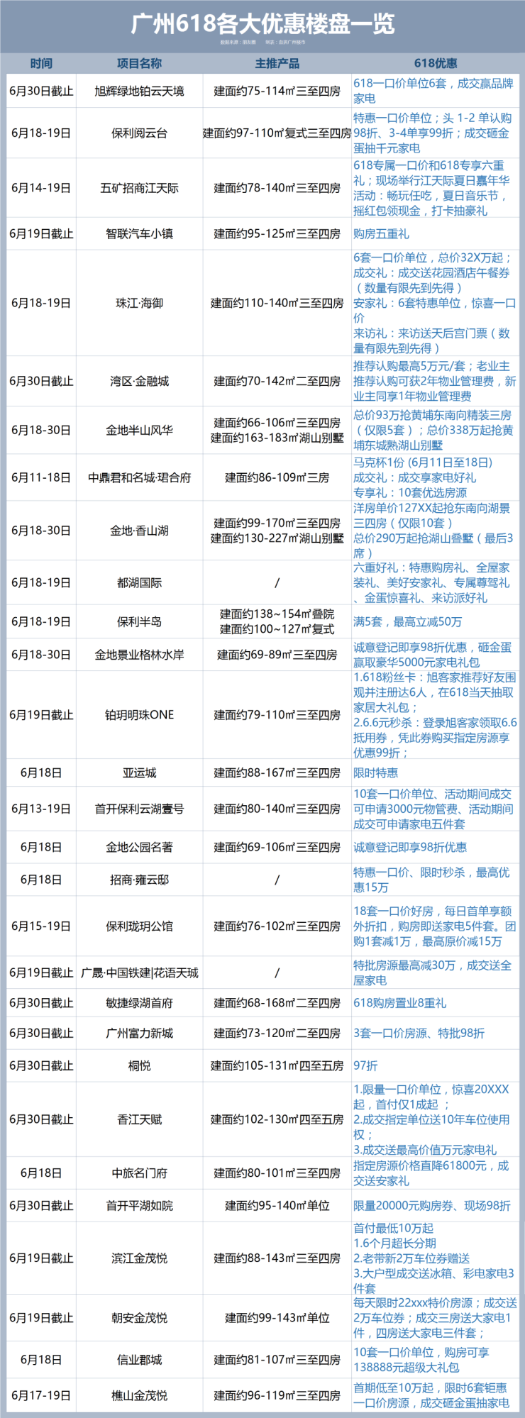 金地集团则抛出618钜惠6重礼,包括广州区域每盘限量18套秒杀房源、活动期间98折优惠、认购享豪华家电......