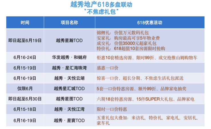 另外,越秀地产广州区域618推出 “去热爱,不焦虑”活动,联动约8盘开启“超长分期计划”、“618不焦虑大礼包”、“无忧购房计划”等优惠大促。