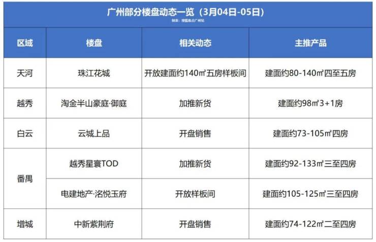 据搜狐焦点不完全统计,3月首个周末(3.04-3.05),珠江花城、云城上品、越秀星寰TOD、中新紫荆府等楼盘动作频频,涉及开盘、加推新货、开放示范区等。
