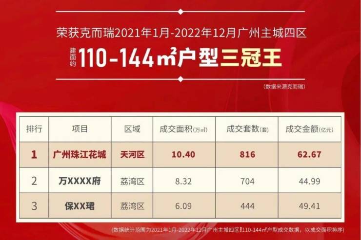克而瑞数据显示,在2021-2022年间,珠江花城可是霸榜主城四区建面约110-144㎡大户型排行。