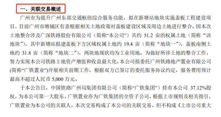 公告显示,增城有意根据相关土地政策对新塘站地块盖板建设区域及周边土地进行整合,广深铁路股份有限公司拟就新塘站地块盖板工程建设项目所涉及的本公司部分权属土地,委托广铁置业开展相关前期工作,服务费用预计较高不超过人民币5,000万元。