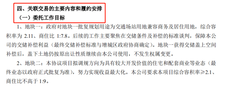 2、地块二:本协议项目拟调规方向为具有较大开发价值的住宅和配套商业等业态(最终业态以政府正式批复为准),努力实现收益较大化。本公司要求本项目综合容积率≥2.1、商住比不高于 1:9。