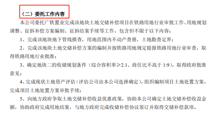 广深铁路股份有限公司委托广铁置业完成该地块土地交储补偿项目在铁路用地行业审批工作、用地规划调整、征拆补偿方案编制、征拆结案手续等工作,包含但不限于以下内容: