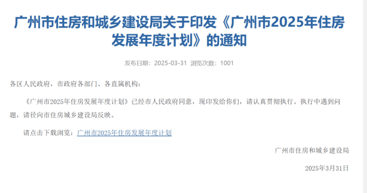 广州首次在市住建局官网发布广州市2025年住房发展年度计划》。