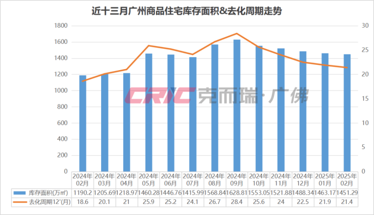 克而瑞数据监测显示,截至2025年2月底,广州商品住宅库存面积1451.29万㎡,去化周期21.4个月,已是连续半年下滑的态势。