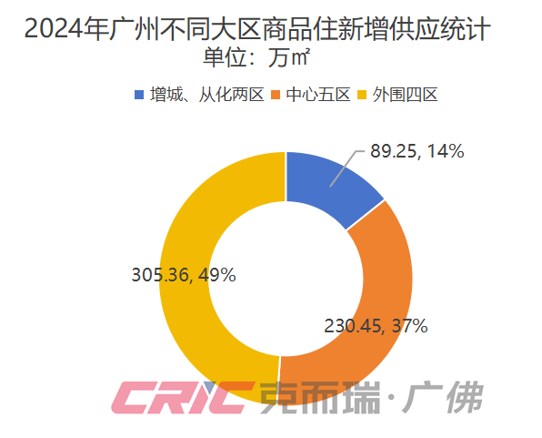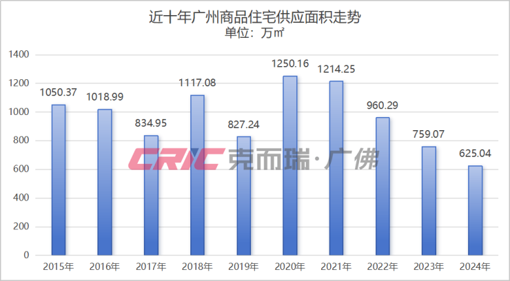具体结合去年广州商品住宅的供求情况,克而瑞数据监测显示,2024年广州商品住宅供应面积625.04万㎡,5.44万套。