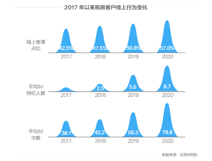 与此同时,购房者线上活跃度有了显著提升。据贝壳研究院数据,2020年每一个购房客户成交前平均需要IM联系近9位经纪人、IM次数平均达80次,较2017年实现了多倍的增长。2020年前8月,贝壳平台上消费者和经纪人共同发起了超3200万次VR带看,相比上年同期增长了425倍。