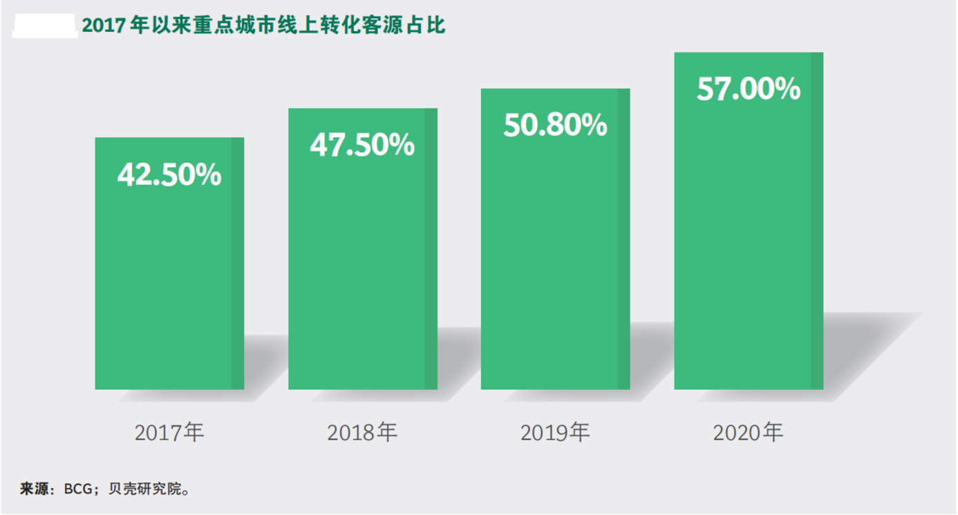 值得注意的是,2020年重点城市购房客群中,来自线上的比例达到57%,相较2017年增长近15个百分点。
