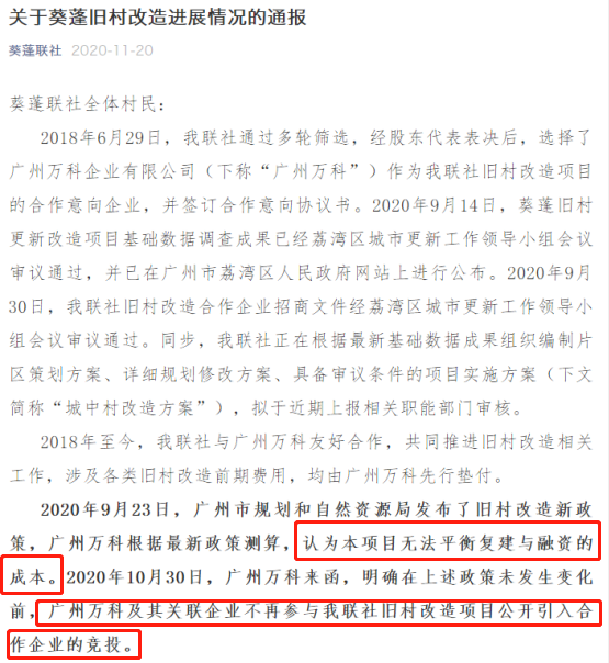 2018年,葵蓬村旧改启动,当时同意广州万科企业有限公司成为葵蓬旧村改造意向合作企业,开展前期工作。2020年10月2日,荔湾区葵蓬村发布基础数据成果正式公示,将用于片区策划方案、项目实施方案编制工作。2020年11月20日,据“葵蓬联社”微信公众号消息,广州万科及其关联企业不再参与我联社旧村改造项目公开引入合作企业的竞投。究其背后的原因,广州万科根据较新政策测算,认为本项目无法平衡复建与融资的成本。直白点就是,做这个项目,广州万科会亏本。