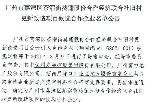 2021年3月10日,葵蓬联社公布候选合作企业名单,保利、富力及招商三家入选。