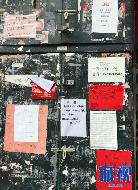 公告栏上,各类出租、招工广告张贴于此。据了解,该村单间到三房,租金300-2000元/月不等。
