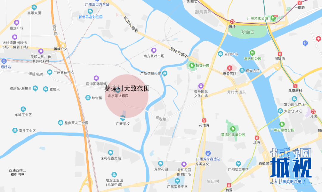 葵蓬村位于花地河西侧,是广佛交界的重要核心区域,占地约1.75平方公里,可以说是“巨无霸”旧改项目,在中心城区并不多见。周边最近的是地铁站为花地湾站,需要公交接驳到达。
