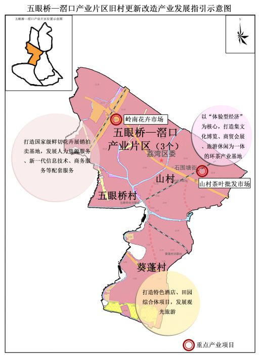 根据相关规划,荔湾区18条旧村庄将全面更新改造,面积合计约4175.67公顷,覆盖全区约七成面积。其中,包含葵蓬村在内的五眼桥—滘口产业片区,五眼桥—滘口产业片区可与佛山产业联动紧密,升级花卉、茶叶批发市场,打造国际采购中心高地,同时强化广佛商务服务业发展;着眼区域经济一体化,可以重点围绕广佛产业互动,探索广佛两地科技人才、科技型企业、孵化器、众创空间的共享机制,促进“互联网+制造”产业项目对接,打造广佛创新创业带,涉及村庄包括五眼桥、山村、葵蓬。