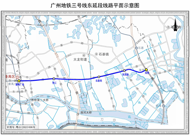 地铁三号线东延段起于既有运营的地铁三号线番禺广场站,终至海傍站,线路全长9.6公里,共设车站4座。全线建成开通后,将实现与四号线的“牵手”,方便亚运大道两侧及亚运城居民出行,对“轨道上的大湾区”的加速形成发挥着重要推动作用。