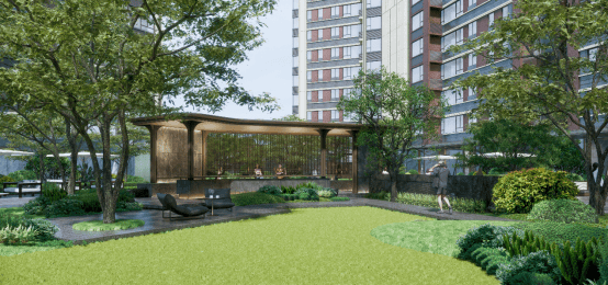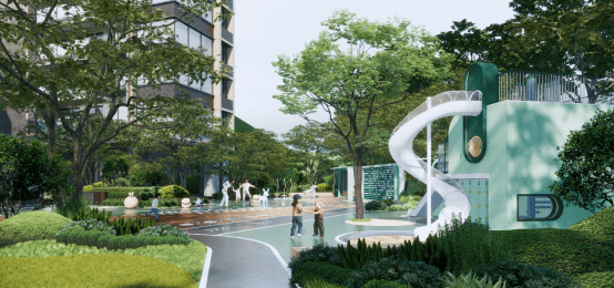 社区还打造了“森林精灵”主题的儿童乐园,充满沉浸感,分区满足各年龄段孩童玩乐和父母的亲子陪伴需求。通过色彩描绘健身图案的健身乐活场,加入乒乓球桌、球网等可移动健身设施,以及全区多个登高健身花园,满足全龄段的业主健身需求。