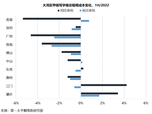 2022年上半年,受全球及国内经济形势严峻、多城疫情反复、市场阶段性供过于求等多重因素影响,大湾区甲级写字楼租金及价格指数均环比下降。