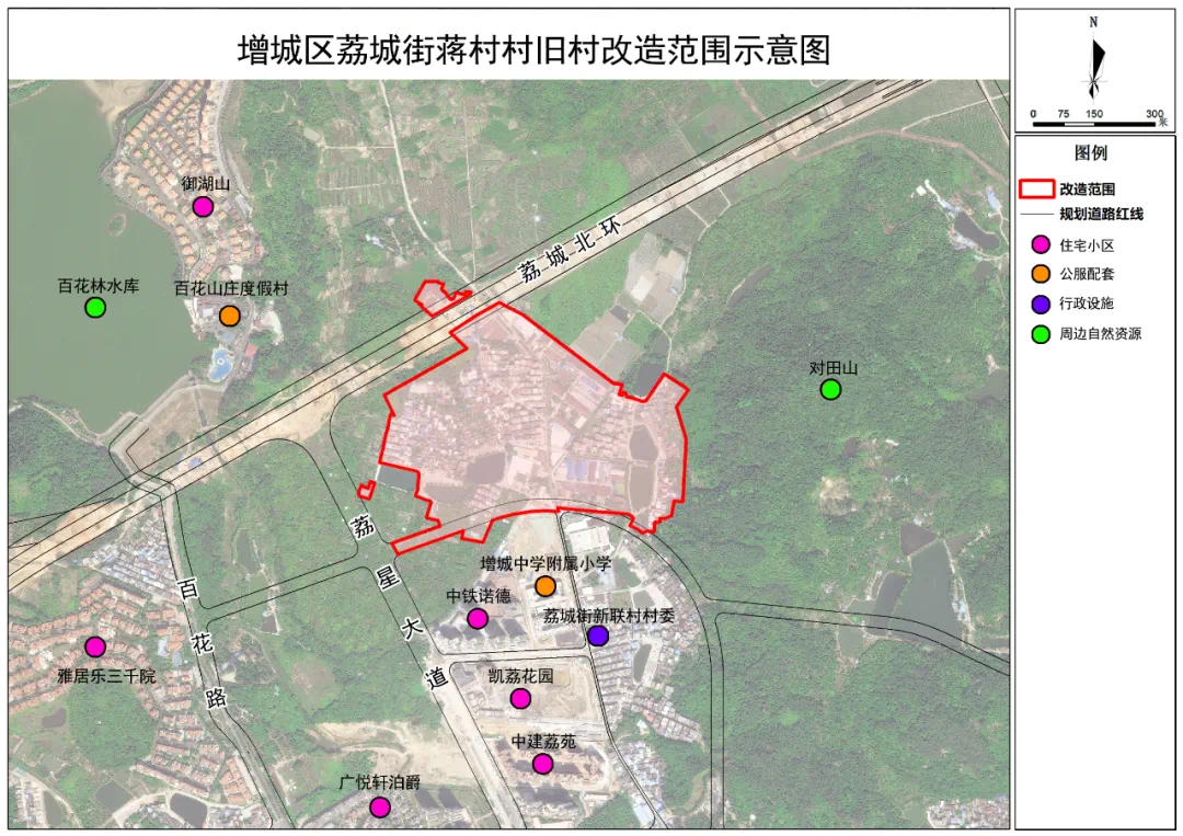 将村村旧改范围示意图蒋村村西临荔星大道,南距广汕公路约2公里,东距从莞深高速出入口约7公里,离地铁21号线增城广场约5公里,临近规划地铁16号线荔城站。